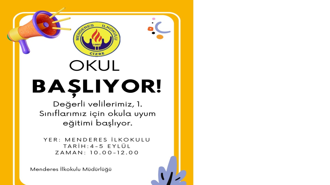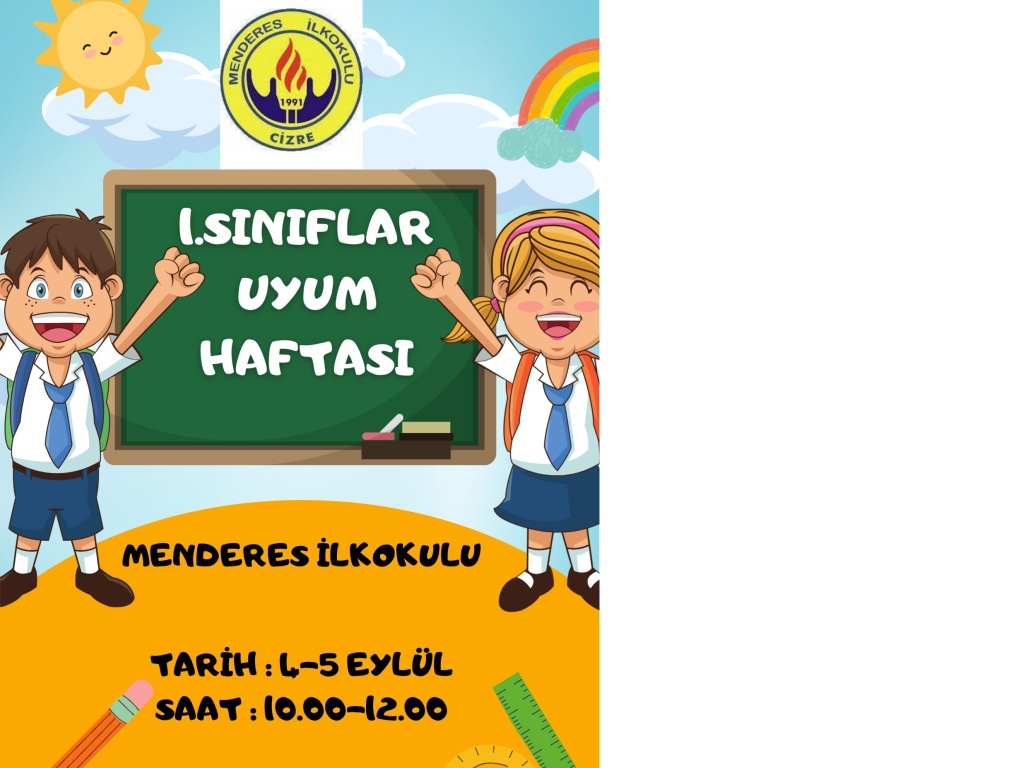 2025-2026 EĞİTİM ÖĞRETİM YILI 1.SINIFLAR UYUM HAFTASI 4-5 EYLÜL TARİHLERİNDE SAAT 10.00-12.00 ARASINDA YAPILACAKTIR. 1.SINIF VELİLERİMİZİN BU TARİHLERDE ÇOCUKLARINI OKULA GETİRMELERİ GEREKİYOR.